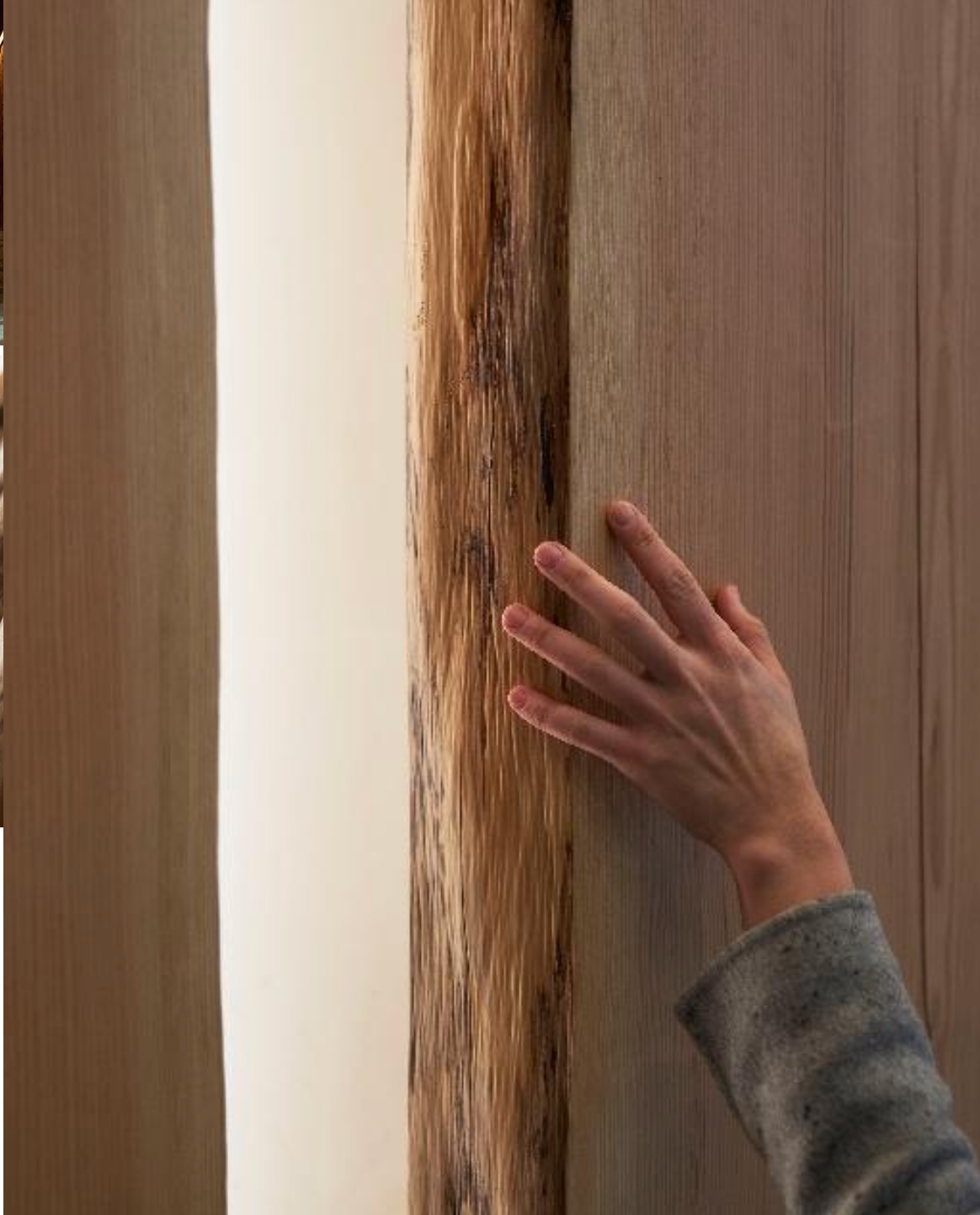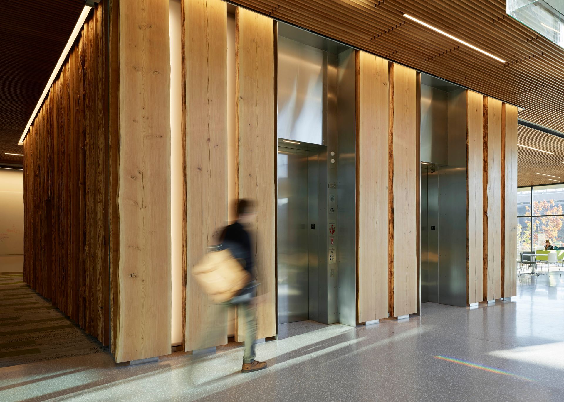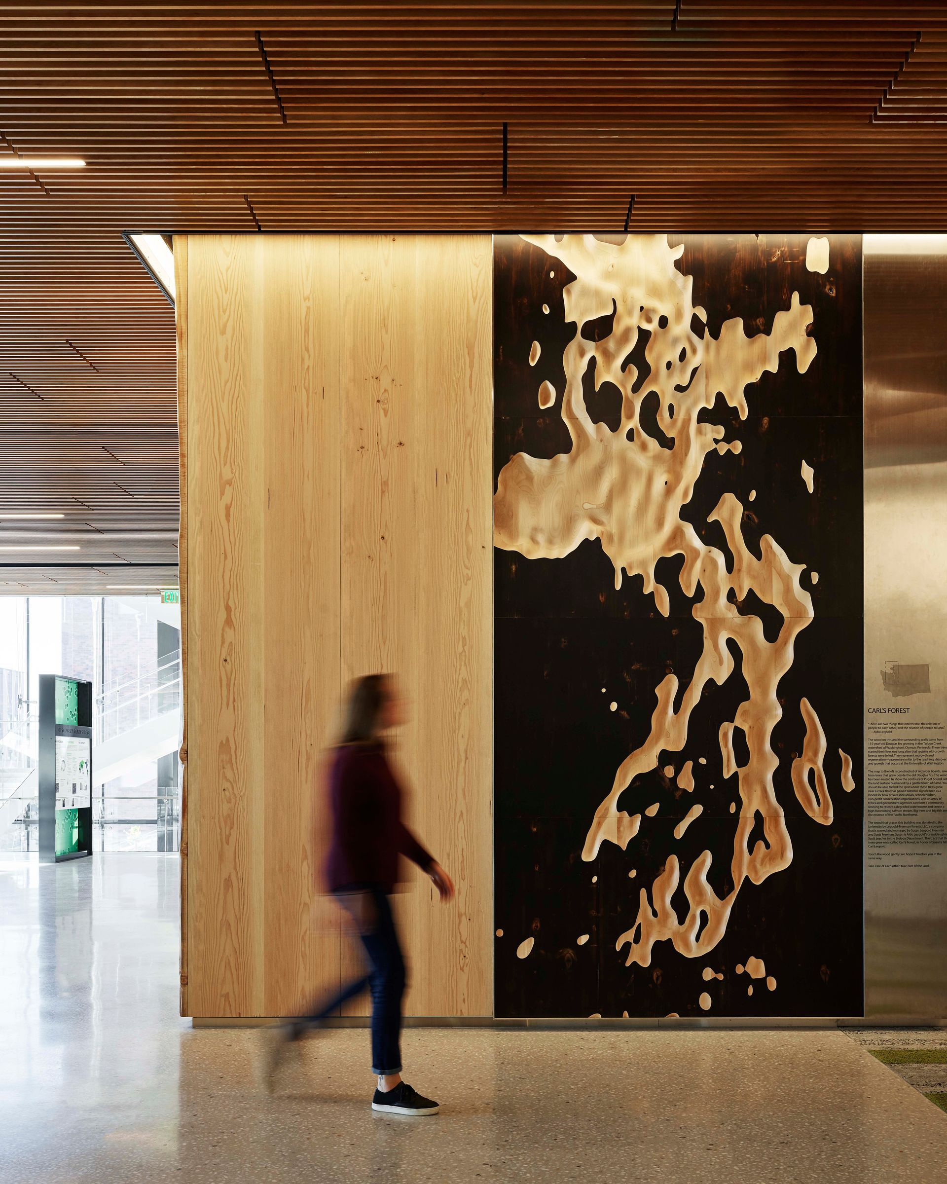 An extensive installation in the lobby is highlighted by a live-edge wall, slabs milled from 125-year-old Douglas fir trees, and a relief map of Puget Sound sculpted from red alder.