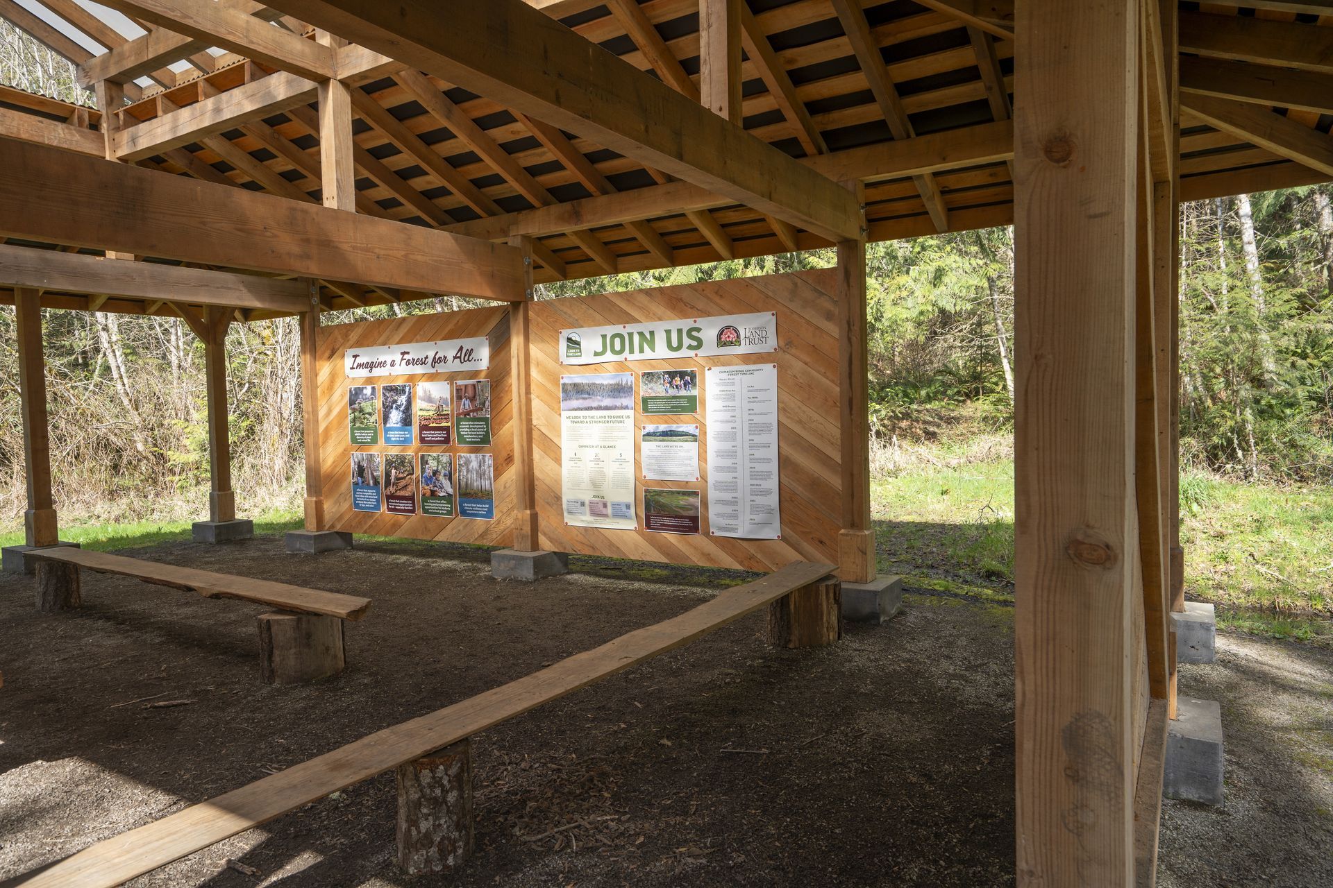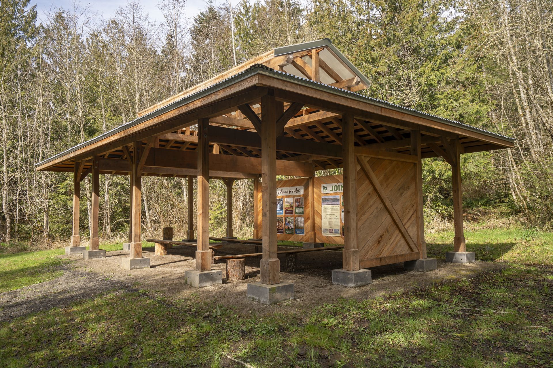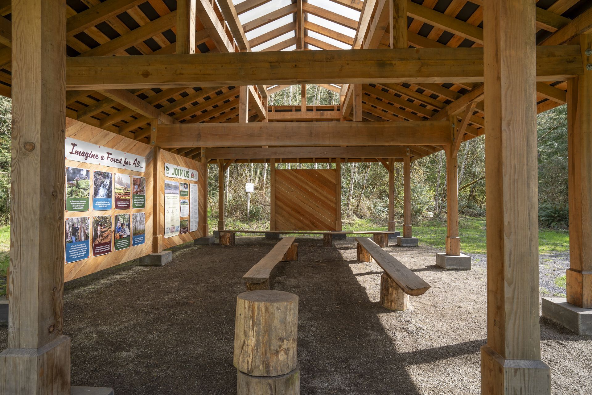 This post-and-beam structure was commissioned by the Jefferson Land Trust and constructed from wood harvested on site.